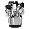 Slim-lined, space-efficient utensil holder with 14 of OXO's most important everyday kitchen tools . Includes flexible turner, 12-inch tongs, square turner, spoon, slotted spoon, grater . Also includes swivel peeler, ice cream scoop, potato masher, can opener, balloon whisk, spatula, meat tenderizer, pizza wheel, and holder . Nylon and silicone tools are safe for non-stick surfaces; heat resistant up to 400 degrees F . Large capacity utensil holder includes a removable drip tray; dishwasher safe .Have all your essential kitchen tools in quick reach with OXO GOOD GRIPS 15 Piece Everyday Kitchen Tool Set. With our slim-lined, space efficient Stainless Steel Utensil Holder, you'll be able to store a collection of OXO's most important every day kitchen tools and gadgets. This set includes our Stainless Steel Utensil Holder which holds our Nylon Flexible Turner, 12" Tongs with Nylon Heads, Nylon Square Turner, Nylon Spoon, Nylon Slotted Spoon, Grater, Swivel Peeler, Ice Cream Scoop, Potato Masher, Soft-handled Can Opener, 11" Balloon Whisk, Silicone Spatula, Meat Tenderizer and a 4" Pizza Wheel. Whether it's your first set of kitchen tools or enhancing your current set, the OXO 15 Piece Everyday Kitchen Tool Set will bring value, function and style to any kitchen.