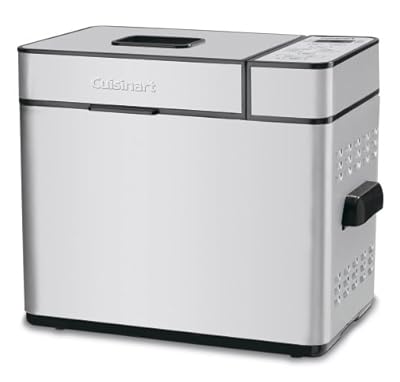 Programmable bread machine bakes 1-, 1-1/2-, and 2-pound loaves . 12 preprogrammed menu options; 3 crust settings; 13-hour delay-start timer . Viewing window; removable lid, pan, and paddle for quick cleanup . Stay-cool handles; measuring cup, measuring spoon, and recipes included . Measures 18 by 12-1/5 by 15 inches .Wake up to the smell of freshly baked bread with this programmable bread machine. Simply add the ingredients, choose from several options using the touch-pad controls, and it takes care of the rest. It will mix the ingredients, knead the dough, let it rise, and bake it to perfection--soft on the inside and crispy on the outside. Choose from 12 preprogrammed menu options; 1-, 1-1/2-, and 2-pound loaf sizes; and three crust settings--light, medium, or dark. Other highlights include a 13-hour delay-start timer, a removable lid with a viewing window, power-failure backup, sturdy stay-cool handles, and a removable kneading paddle and bread pan for easy cleanup. Accessories include a measuring cup, a measuring spoon, and foolproof recipes for gluten-free breads, as well as jams and sauces. With its modern design and embossed logo, the bread machine measures 18 by 12-1/5 by 15 inches. From the Manufacturer Nothing says “home” like warm, just-baked bread. With this programmable automatic breadmaker from Cuisinart, all you have to do is add ingredients and select the time you’d like it to start the process. The breadmaker mixes it, kneads it, and bakes it. It also come with lots of bread recipes, as well as recipes for pastries and jams. You’ll discover you’ve bought yourself much more than a breadmaker (while still enjoying the lovely smell and taste of homemade bread). For safety, this unit is equipped with a power failure backup system. In case of any disruption of power supply, the unit will store in memory the stage of bread making cycle and resume once power is restored. The power back up feature can maintain memory for a power failure up to 15 minutes. And for easy clean up, the removable pan and paddle, cup, and spoon are dishwasher safe. The removable lid and touchpad control wipe clean with a damp cloth; fewer crevices make the unit easier to clean.